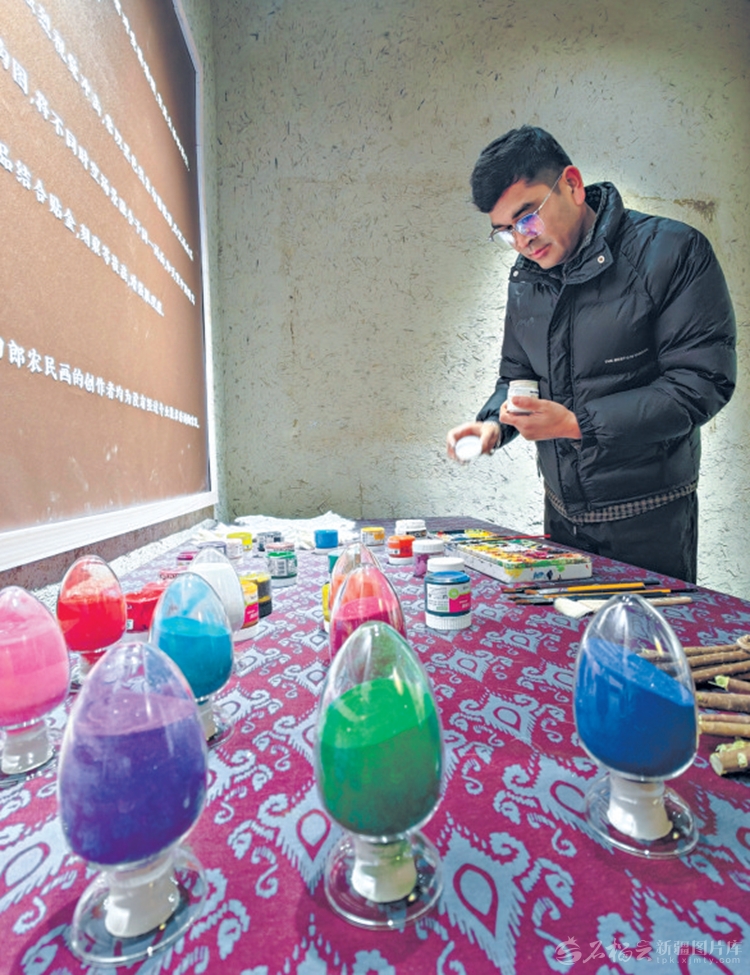 1月14日,乃比江·阿布都热合曼在绘画前调制颜料。