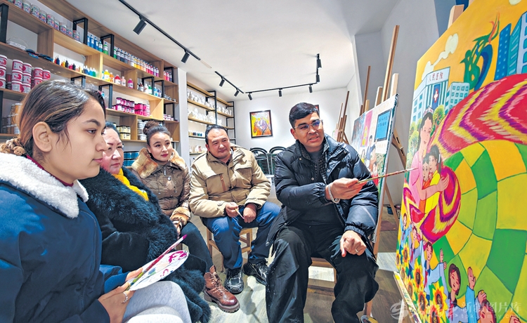 1月14日,乃比江·阿布都热合曼(右一)和农民画家一起创作。