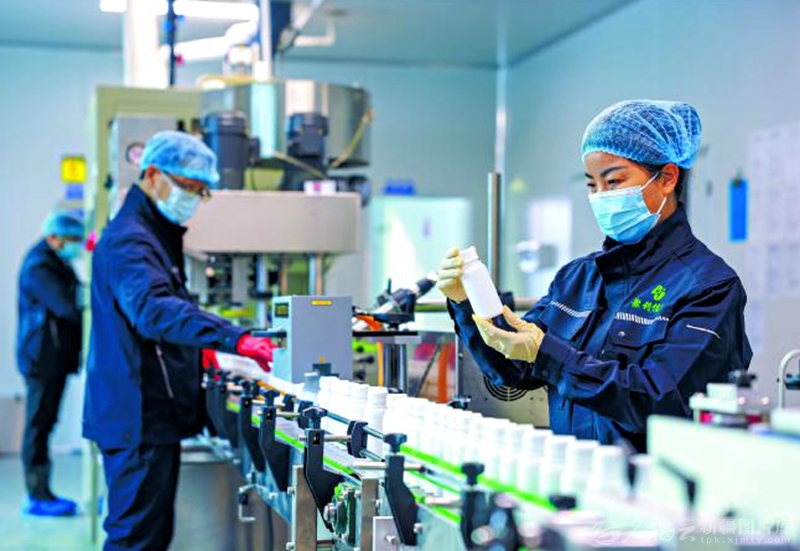 1月16日,技术人员在位于呼图壁县的新疆聚利信德生物药业有限公司全自动生产车间查验产品。该公司主要生产兽用消毒剂、杀虫剂等4个品种共34个产品,通过线上线下相结合的方式销往全疆各地,去年销售额达600万元。 □马光元摄