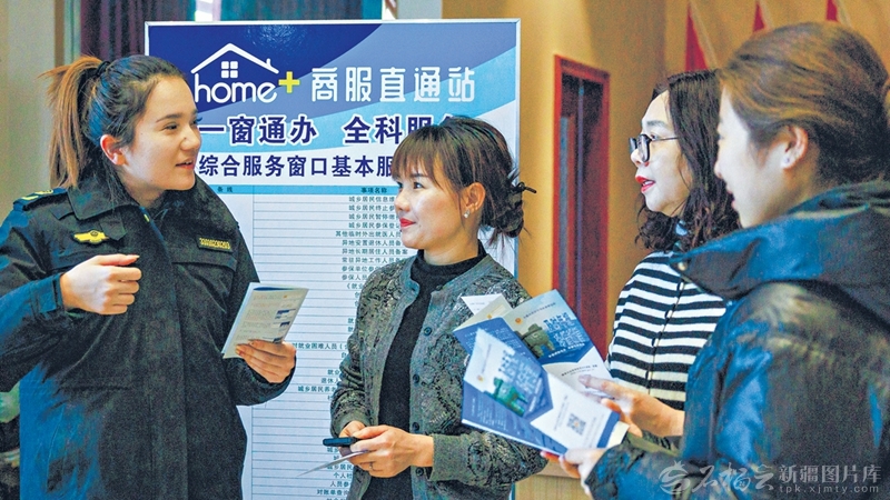 1月20日,工作人员为商户讲解营业执照办理登记流程。当日,乌鲁木齐市沙依巴克区炉院街街道炉院北街社区“Home+商服直通站”正式启用。推行“联署办公+一窗通办”机制,企业、商户实现补贴申报、证照办理、政策咨询等高频事项“只进一扇门”。□孙振嵩摄