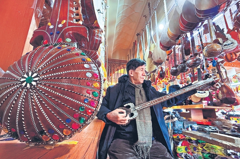 1月21日清晨,阳光铺满新疆国际大巴扎步行街的石板路,艾尔肯·吐么尔的乐器店里传来悠扬的琴声。二胡的婉转与热瓦普的奔放交织流淌。店内,来自贵州的乐器爱好者杨昭锦正与艾尔肯切磋弹奏技法,两人虽初次见面,指尖的默契却似老友重逢。“早就听说艾尔肯师傅的制琴技艺出众,又同是爱乐之人,能和他交流切磋,不虚此行。”杨昭锦说。
