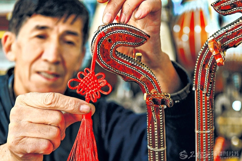 21日,艾尔肯·吐么尔给制作好的乐器系上中国结。