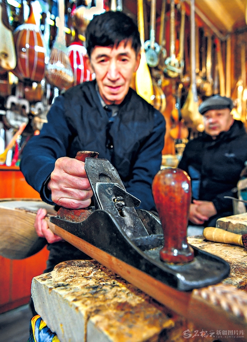 令众多乐器爱好者慕名而来的艾尔肯师傅,是维吾尔族乐器制作技艺的传承人。艾尔肯的家乡疏附县吾库萨克镇托万克吾库萨克村,被誉为“中国民族乐器村”。他从小跟随父亲学艺,从稚嫩模仿到潜心钻研,父亲的言传身教将“精益求精”深深烙入他的心底。