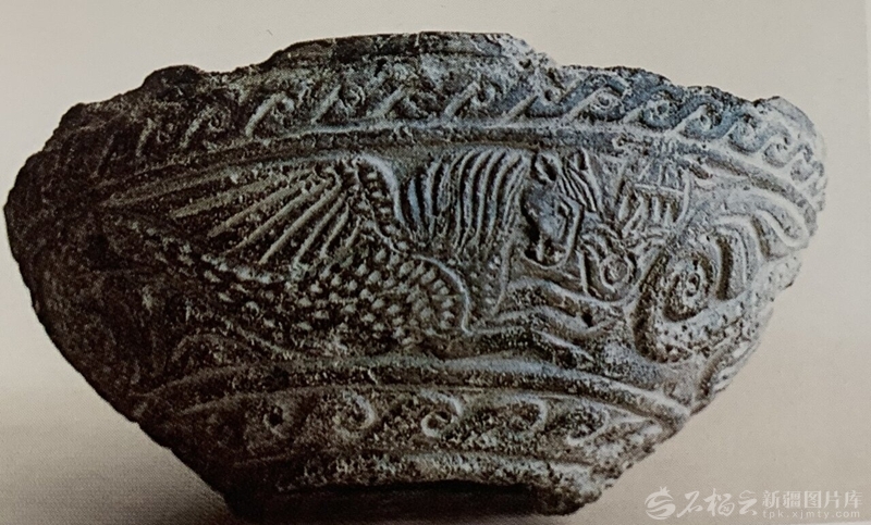 秦汉时期,马纹被广泛应用于画像石、陶俑、丝织品等各类工艺品上,如汉代蓝地人首马身纹缂毛布,其上描绘有人骑于马上的场景。这时不少玉环玉璧都有马首蛇躯,鳞片遍布,俨然龙马化形。汉代广泛流行的天马实则为龙马。魏晋时期的石刻以及唐代的石雕龙纹,其龙头皆似马首且生有翅羽,尽显龙马之态,并与当时的联珠纹、团窠纹相组合,成为当时织锦的典型纹样之一。如吐鲁番木头沟出土的唐代联珠翼马纹锦等,皆可视为龙马。又如新和县通古斯巴西古城出土的浮雕马首龙身鹰翅纹灰陶范,其浮雕也是典型的龙马形象。