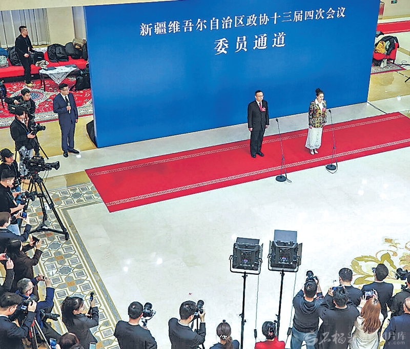 1月26日,自治区政协十三届四次会议“委员通道”集体采访活动现场,刘文、孔都孜扎衣塔亚两位委员接受采访。
