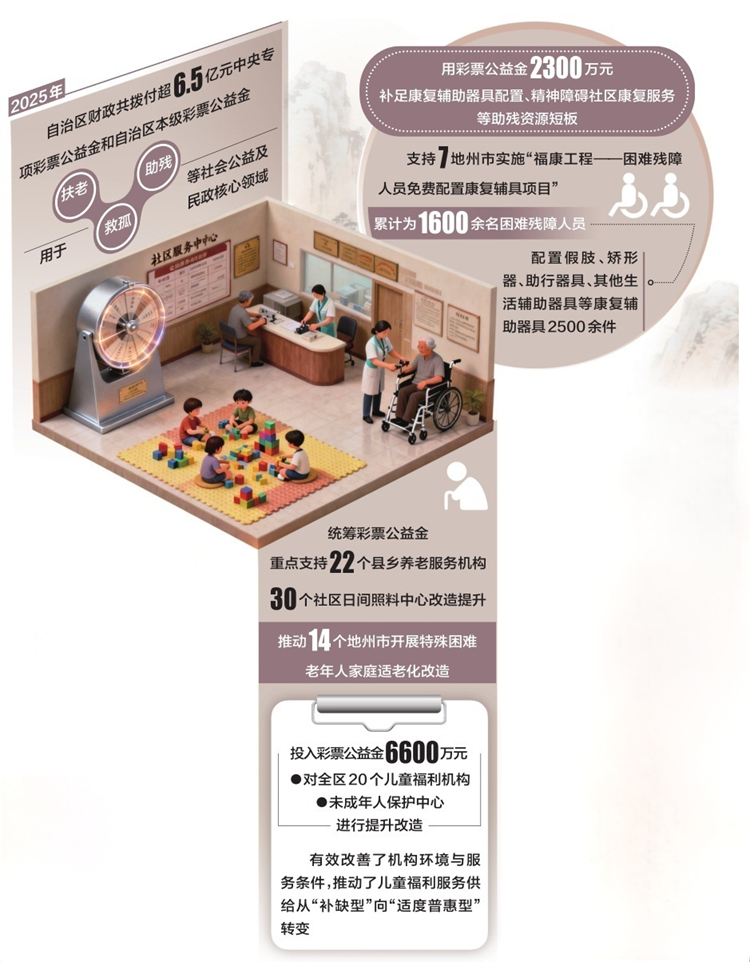 近日,记者从自治区财政厅了解到,2025年,自治区财政共拨付超6.5亿元中央专项彩票公益金和自治区本级彩票公益金,用于扶老、救孤、助残等社会公益及民政核心领域。