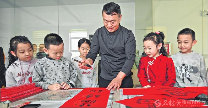 1月25日,书法老师教小朋友书写春联和“福”字。当日,呼图壁县图书馆内,家长和小朋友们学习制作祈福挂饰,阅读春节绘本,大家沉浸式体验传统年俗,在浓浓墨香中喜迎新春。□陶维明摄