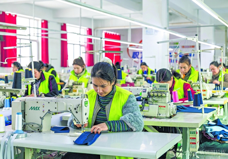 1月31日,在泽普县赛力乡新疆幸福服装有限公司的厂房里,工人正在赶制服装订单供应市场。该服装企业有3个加工车间,全在附近乡镇,目前已吸纳180多名当地群众就业。□张昀摄