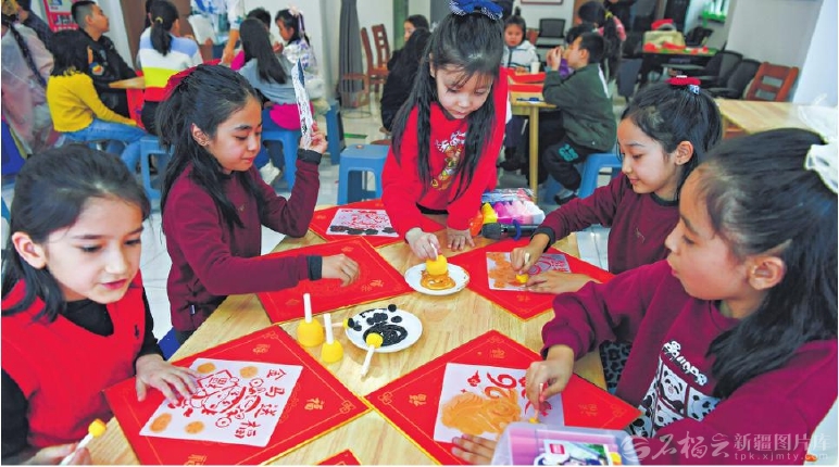 2月3日,小朋友在乌鲁木齐市天山区二道桥街道跃进街社区居民活动室里拓福字。当日,该社区组织辖区各族居民,开展剪窗花、拓福字等活动,共迎新春佳节。□石榴云/新疆日报记者约提克尔·尼加提摄