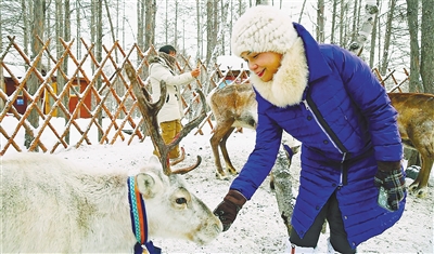 与驯鹿亲密接触,撮罗子前打卡,雪蘑菇下留影……冬日,在呼伦贝尔市根河市敖鲁古雅使鹿部落景区,参加海尔集团组织的经销商旅游团队的广东省江门游客梁芳感叹:“来到根河,走进冰雪世界,感觉非常美妙,就像童话里一样。”