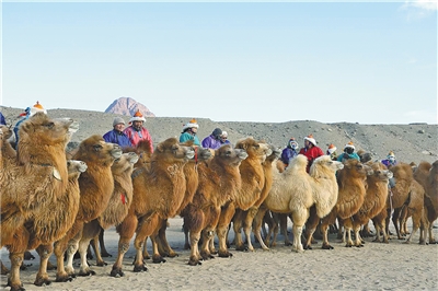 冬日的阿拉善右旗天空湛蓝,温暖的阳光洒在巴丹吉林沙漠上,近日,阿拉腾敖包镇周边地区的牧民们身着节日盛装,将体态壮硕、高大威猛的骆驼打扮得更加光鲜亮丽,一起参加阿拉善右旗“神驼启航”冬季骆驼文化那达慕大会。