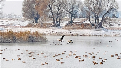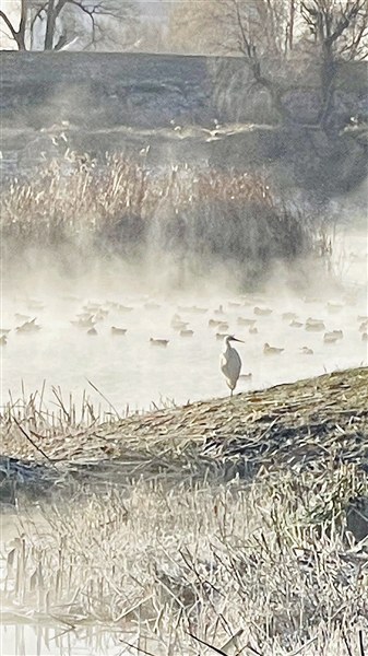 冬至过后,呼和浩特市最低气温降至零下十几度。位于大黑河流域玉泉区段的“千岛湖”,由于注入的再生水温度较高,形成了水汽升腾、云雾飘渺的景致。上千只赤麻鸭“铺”在水面,咕咕嘎嘎的欢声此起彼伏。