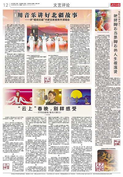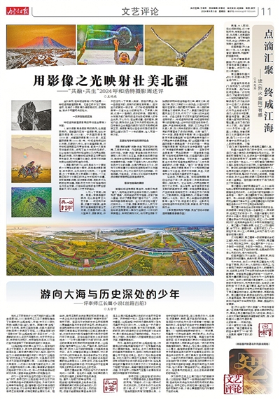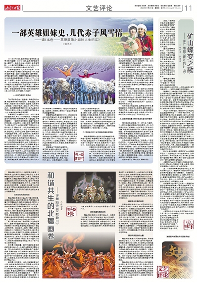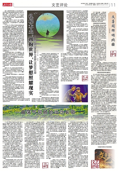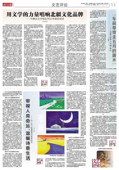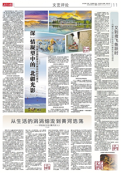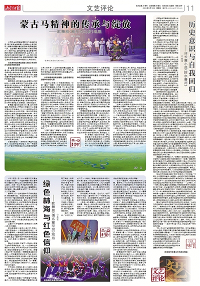 2024年,《文艺评论》版展现北疆文化多种样貌的文章浓墨重彩。《一部英雄姐妹史几代赤子风雪情——读〈本色——草原英雄小姐妹人生纪实〉》《蒙古马精神的传承与绽放——歌舞剧〈雕花的马鞍〉观后》《彩云映照辽河之滨——歌舞剧〈彩云飘落的地方〉观后》《扎根本土,拥抱世界,让梦想照耀现实——实验剧〈骑马周游世界〉观后》《和谐共生的北疆画卷——评舞蹈诗剧〈敕勒川〉》《从生活的涓涓细流到黄河浩荡——评报告文学〈黄河好人〉》《“车前草带走五月的露水”——诗集〈被群山包围〉赏析》等文章,让读者全方位领略了北疆大地的文化之美、文学之美、艺术之美、生活之美。
