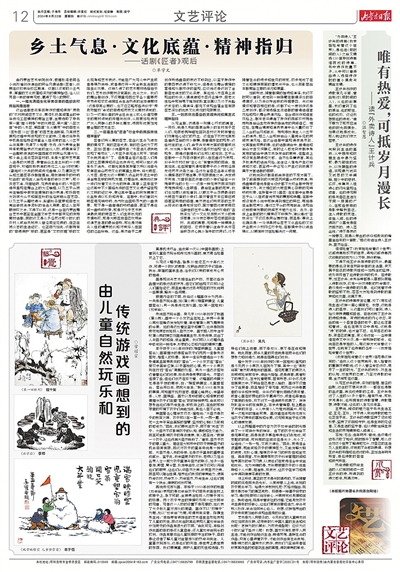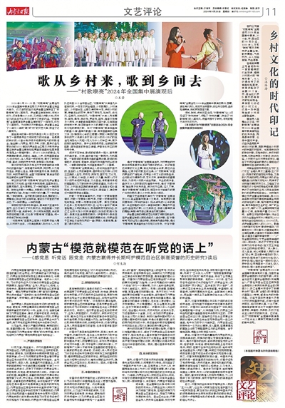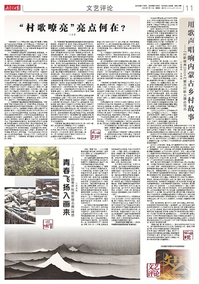 2024年,《文艺评论》版聚焦北疆文化品牌建设。刊发反映北疆文化建设的评论文章约50篇,这些文章立意高远、内蕴丰厚、精彩纷呈。其中《中国北方乡村文化的一幅全景图——评赵海忠长篇小说〈匠者〉》《乡土气息·文化底蕴·精神指归——话剧〈匠者〉观后》《大型原创话剧〈对夹〉——红色文化与非遗传承的交相辉映》等文章,书写出中华优秀传统文化的传承与弘扬;《“村歌嘹亮”亮点何在?》《歌从乡村来歌到乡间去——“村歌嘹亮”2024全国集中展演观后》《用歌声唱响内蒙古乡村故事——“村歌嘹亮”2024内蒙古村歌大擂台观后》《民之所需歌即咏之——评“唱响北疆”2024内蒙古民歌大会》等文章,涌动着内蒙古大地篷勃向上的文化脉动;《用文学的力量唱响北疆文化品牌——内蒙古文学馆系列文学展览述评》《北疆礼赞时代颂歌——“艺韵北疆——内蒙古自治区美术雕塑书法摄影跨年大展”观后》《内蒙古代表性杂技节目的继承与创新》等文章,彰显了内蒙古深厚的文化底蕴;《“深”情凝望中的“北疆光影”——内蒙古摄影展深圳展出的时代意义》《幸福无处不在——“第二十六届内蒙古摄影艺术展”观后》《用影像之光映射壮美北疆——“共融·共生”2024呼和浩特摄影周述评》等文章,全景展现了北疆大地的自然风光之美、火热生活之美;《内蒙古水彩画创作述略》《青春飞扬入画来——“2024中国青年版画家提名展”随想》《审视人类命运,温暖诗意生活——巴·毕力格漫画的审美取向》等文章,为读者呈现了内蒙古缤纷绚丽的绘画艺术盛宴;《和合之美交融之光团结之魂——评民族交响音乐会〈黄河长城在这里握手〉》《用音乐讲好北疆故事——评“唱响北疆”内蒙古新星新作演唱会》等文章,在跳动的旋律中,诉说着内蒙古音乐艺术的灵动与荣光。