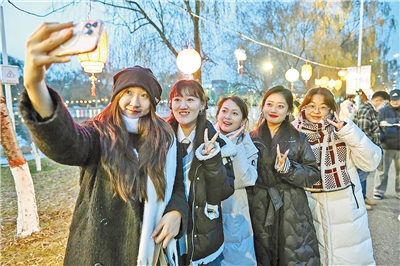 | 内蒙古师范大学第十五届花灯游园会上,学生打卡拍照。 |