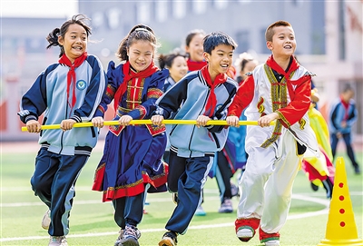 | 呼和浩特市玉泉区南柴火市街小学开展四人绕桩趣跑游戏。