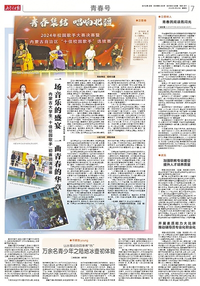 展示激昂风采是青年成长成才的绚丽华章。这一年,内蒙古各部门积极搭建舞台,让广大青少年炫出青春风采,奏响动听华章。我们精心推出《新人“顶梁”骑兵精神代代相传》《“趣”研学“实力圈粉”青少年》《走!上青年夜校去!》《内蒙古大学生“十佳校园歌手”圆满落幕——一场音乐的盛宴一曲青春的华章》《青少年托起冰雪运动美好未来》《主旋律电影与青春同频共振》等精品稿件,展现青春脉动,激扬青春力量。