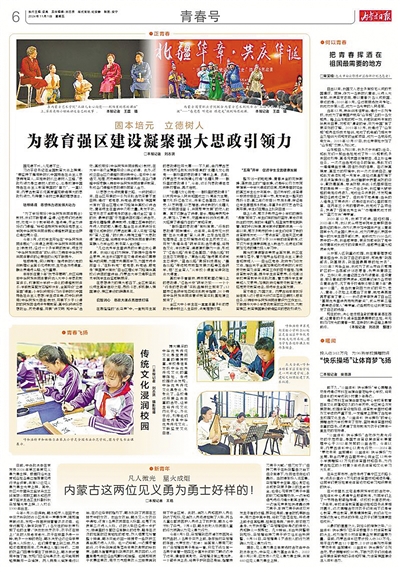 坚定理想信念是青年成长成才的力量之源。这一年,内蒙古以铸牢中华民族共同体意识为工作主线,聚焦青少年思想引领,着力构建铸牢中华民族共同体意识协同育人工作格局,不断完善教学体系,持续拓宽实践教育形式,铸牢中华民族共同体意识教育取得显著成效。我们重磅推出《固本培元立德树人——为教育强区建设凝聚强大思政引领力》《上一堂生动的思政实践课让青春奋斗与时代同频》《在行走中上好“大思政课”》《解锁思政名师工作室的“育人密码”》等深度报道,充分关注学校这个铸牢中华民族共同体意识教育的主阵地,为青年成长成才充分赋能,为典型经验提供交流借鉴平台,为全方位建设“模范自治区”贡献力量。