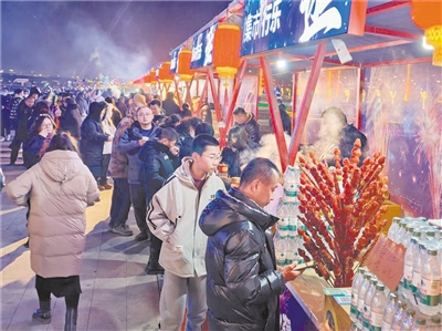 12月31日晚,伊利健康谷国潮美食集市人头攒动。当日,呼和浩特市围绕“夜耀北疆跨年青城”主题,通过灯光秀、烟花秀、文艺演出、冰雪体验、国潮巡游等活动形式,举办“8+N”跨年夜系列活动。本报记者郑学良摄