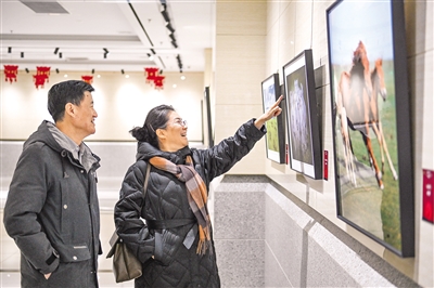 1月3日,观众在参观摄影作品。当日,“驰骋北疆赓续华章——‘群星璀璨’蒙古马精神主题摄影作品展”在呼和浩特市文化馆开展,以多元化视角展现蒙古马精神和全区各族人民坚韧不拔、勇往直前的精神风貌。本报记者王磊摄