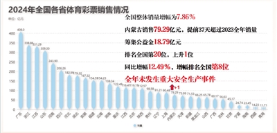 内蒙古体彩围绕“抓党建强引领、抓廉政转作风、抓融合促发展、抓改革强基础”的发展目标,以“1+2+3+N”党建工作法为抓手,强化政治责任,锐意改革创新,创新品牌宣传,加强渠道建设,耕植市场运营。全区体育彩票销售79.29亿元,全国排名第20位,同比上升一位(全国仅有4个省份排名上升,内蒙古名列其中),同比增长12.49%,高于全国平均水平4.63个百分点,同比增幅稳居全国第8位,市场份额达64.33%,筹集公益金18.9亿元,同比增长11.12%,代扣个人偶然所得税金1.04亿元,全区4个盟市销量破10亿元,销量、筹集公益金、代扣个人偶然所得税三项指标再创历史新高,为全区体育事业和社会公益事业高质量发展注入强大动能,以实际行动为自治区办好两件大事和闯新路进中游贡献了体育彩票力量。