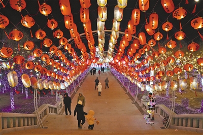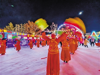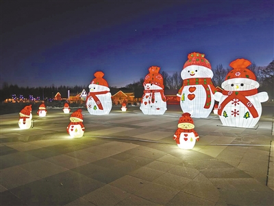 与此同时,乌兰浩特市的大街小巷也被装扮得红红火火,4万多个造型各异的彩灯挂件将年味拉满。华灯初上时,三合民俗风情步行街、义勒力特镇的“雪人天团”等景点更是灯火辉煌,美不胜收。