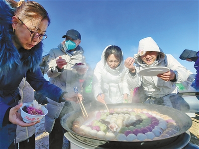 年货大集同样热闹非凡,19口大锅一字排开,热气腾腾,香气扑鼻。新鲜的猪肉、润滑香甜的黏豆包等美食琳琅满目,商户的吆喝声与人们的欢笑声交织在一起,构成了一幅温馨而热烈的节日画卷。