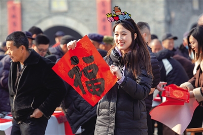 1月21日,在山东省淄博市高青县举办的“黄河大集”送福进万家活动现场,市民在展示刚刚领到的福字。新春临近,各地举行写春联、写福字活动,书法爱好者挥毫泼墨为广大市民送去祝福。新华社发