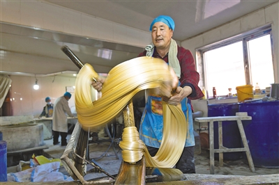 工坊里,糖团在呼和浩特市级麻糖非遗传承人、村民王明在和几位拉糖师傅的手中缓缓变长、变细,逐渐显露出自然的纹理,并泛出金色的光泽。