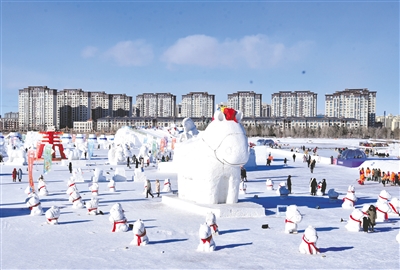 1月30日,市民在造型别致的“马嘟嘟”雪雕下游玩。春节前夕,锡林浩特市在锡林湖冰面上打造了“锡湖冰雪欢乐汇”,给市民送上一份特别的节日礼物,让大家在家门口感受冰雪艺术的魅力。本报记者巴依斯古楞摄