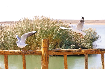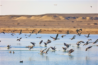 | 12月2日,阿拉善盟额济纳旗东居延海上候鸟翩跹。 |