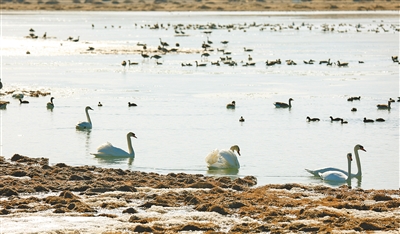 □文/本报记者张慧玲图/赵勇强 天鹅等候鸟接连来临,冬日的居延海热闹起来。