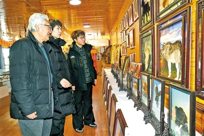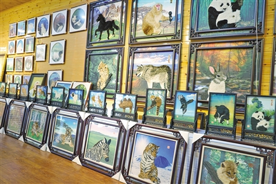 从相皮、辨色到栽植、推毛,完成一幅作品要经历24道技法。作为察哈尔毛绣内蒙古自治区级非物质文化遗产代表性传承人,肖占贵对这门艺术有着独到见解:“我们不仅要制作出生动逼真的动物形象,还要赋予它环境语境,”他抚摸着即将完成的作品,“你得知道这只鹿是在冬夜的雪原上,还是在夏日的黄昏里。”