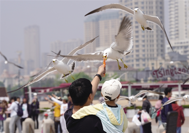5月22日,游客在大连星海广场给海鸥喂食。初夏时节,海滨城市辽宁大连逐渐进入旅游旺季,各景区游客明显增加,游客们或在大自然亲近野生动物,或去动物园、海洋馆参观游览,度过快乐时光。摄影/新华社记者 章 磊