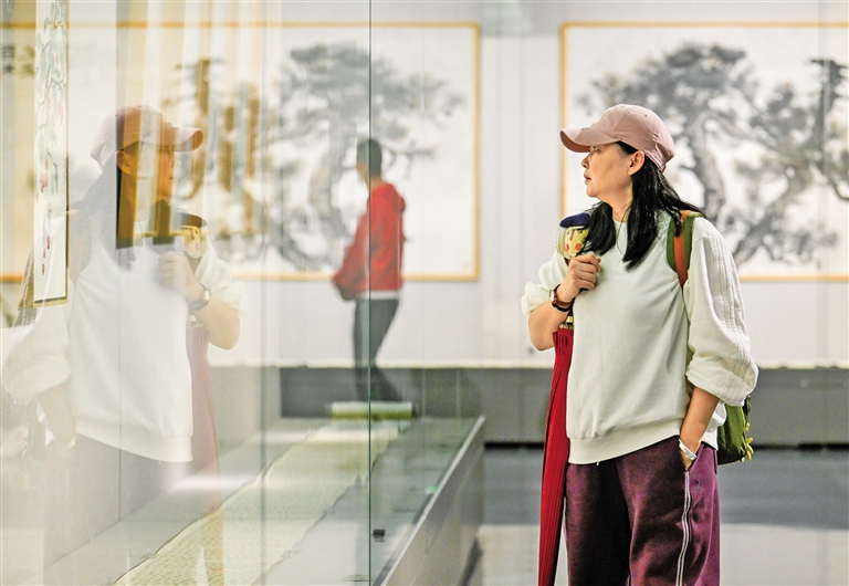 6月5日,呼和浩特市民在欣赏中国画。当日,铸牢中华民族共同体意识——籽籽同心·白艳春中国画作品展在内蒙古美术馆开幕。据了解,本次共展出80幅花鸟画系列作品。摄影/草原云·北方新报首席记者 牛天甲