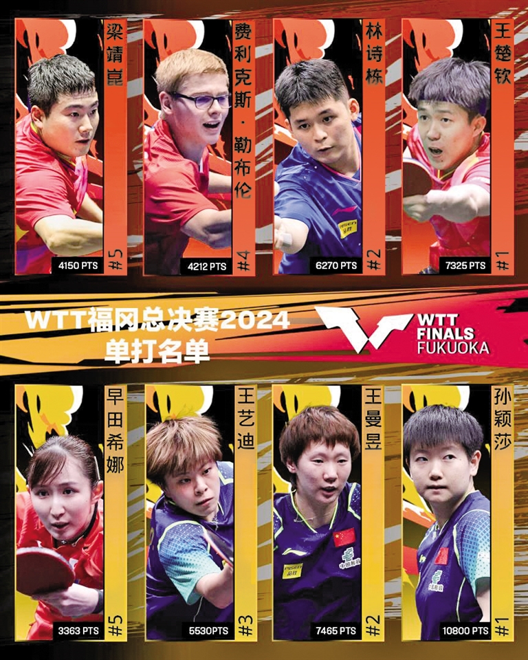 北京时间11月13日,WTT福冈总决赛单打参赛名单正式公布。国乒共有4男5女入围,奥运会单打冠军樊振东、马龙、陈梦退出比赛。 本届WTT总决赛将于本月20日至24日在日本福冈北九州市立综合体育馆举办。届时,世界顶尖的男、女单打各16名球员和男、女双打各8对组合将亮相“八极场”,争夺1500点世界排名积分。