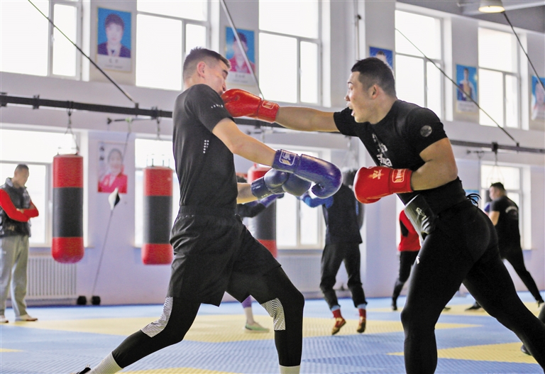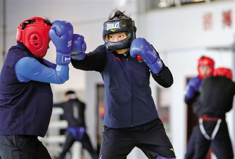 “把身体运转起来,出拳速度才会快。”“注意力集中,不要看旁边,保持与对手的前后距离!”“脚下假动作,腰部假动作,都要运用起来才能欺骗对手,击打对方……”12月1日一早,伴随着动感十足的音乐,内蒙古拳击队的队员们两两一组展开对抗训练。运动员们拳风呼啸,你来我往间汗水湿透了训练服,几名教练穿梭在队员之间不时地讲解指导。这,便是今年内蒙古拳击队的冬训日常。 在训练馆里,记者看到了熟悉的面孔。在巴黎奥运会获得银牌的杨柳全副武装,投入到紧张的训练当中。“今年冬训是全国十五运之前的最后一个冬训了,希望借助这一阶段恢复体能,强化技术,十五运的目标肯定是摘金啦!”杨柳说。巴黎奥运会后,李倩、杨柳带着一金一银归队,为内蒙古拳击队带来了巨大的激励。队员们个个向榜样看齐,全力以赴投入训练。“有了奥运会的历练,对于全运会的备战就会更加游刃有余。所以现在我不仅会关注自己的训练状态,也会和队里的小队员们分享自己的经验方法。”杨柳说。
