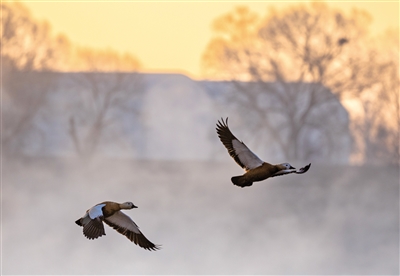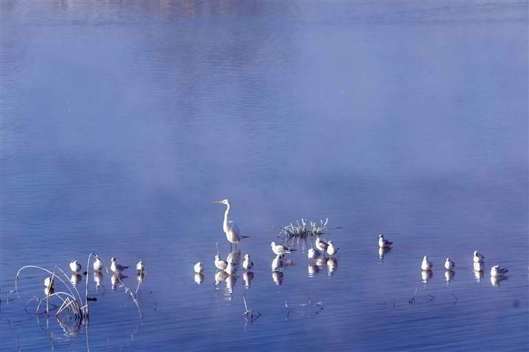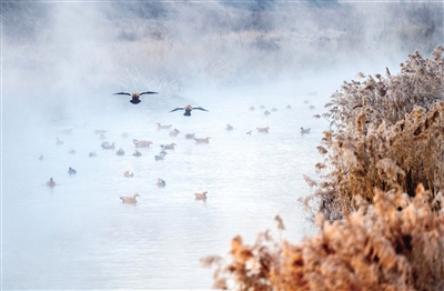 12月7日,当第一缕晨光温暖地洒在呼和浩特市玉泉区大黑河郊野公园内,白鹭和成群的赤麻鸭或觅食休憩,或展翅翱翔,雾气氤氲中与冬日晨光相映成趣,构成了一幅美丽的生态画卷。摄影/草原云·北方新报首席记者 牛天甲