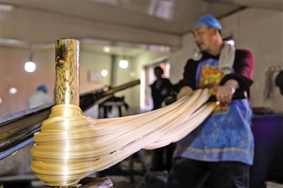 糖团在拉糖师傅的手中缓缓变长变细