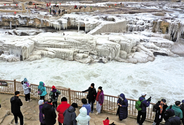 12月24日,游客在山西吉县黄河壶口瀑布景区赏景。近日,受持续降温天气影响,位于山西吉县和陕西宜川县交界的黄河壶口瀑布出现“冰瀑玉壶”景观,吸引不少游客前来观赏。(据新华社报道)