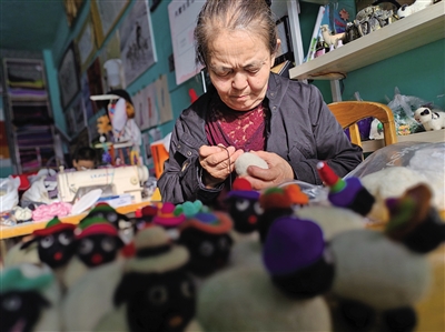 一团洁白蓬松的羊毛,在阿拉腾图雅手中被扭成一个小球并扎紧,然后用带倒刺的长针不停扎,直到它固定成型,小羊的身体就做成了。随后,她还要用不同颜色的羊毛制作羊头和四只脚,以及一顶色彩艳丽的小帽子,这样一只憨态可掬的小羊就做成了。 制作这样的手工小羊,阿拉腾图雅每天可获得200多元收入,这对全职妈妈来说是个不错的工作,她已经干了两年多。阿拉腾图雅工作的地方,是锡林郭勒盟正蓝旗“巧手”手工艺培训基地。在这里,有58名最小20多岁,最大69岁的当地牧民做兼职。