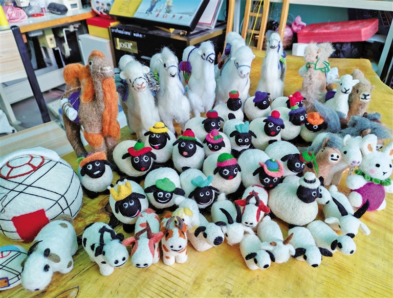1月4日,记者来到培训基地,七八名当地妇女正在制作牛、马、羊、骆驼等手工玩偶。一团团羊毛用一根针就能变身成为形态各异、惟妙惟肖的小动物,让人叹为观止。