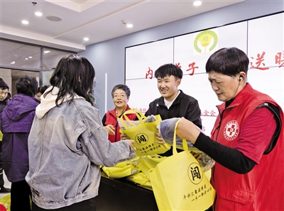 王中禄(右二)向学妹赠送裤子