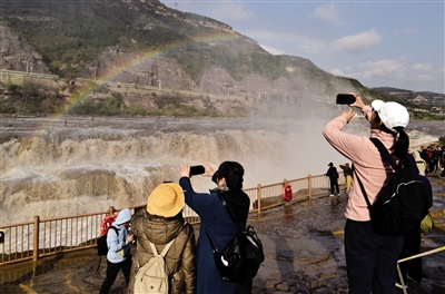 10月27日,游客在山西吉县黄河壶口瀑布景区欣赏“彩虹桥”景观。当日,位于山西吉县和陕西宜川县交界的黄河壶口瀑布景区天气晴好,飞溅的水雾在阳光照射下,形成一道壮美的“彩虹桥”。(据新华社报道)