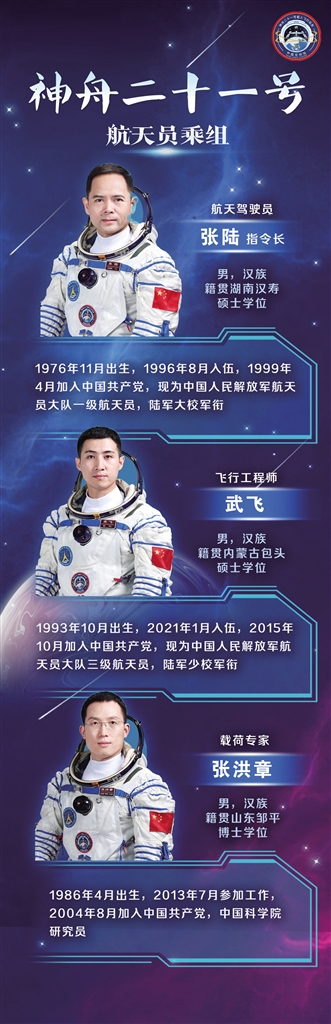 10月30日上午,神舟二十一号载人飞行任务新闻发布会在酒泉卫星发射中心举行。中国载人航天工程新闻发言人、中国载人航天工程办公室综合计划局局长张静波在会上表示,经研究决定,瞄准10月31日23时44分发射神舟二十一号载人飞船,飞行乘组由张陆、武飞、张洪章组成,张陆担任指令长,3名航天员分别为航天驾驶员、飞行工程师和载荷专家,涵盖了我国现役3种航天员类型。 目前,船箭飞行产品质量受控,航天员乘组状态良好,地面系统设施设备运行稳定,空间站组合体状态正常,具备执行发射任务的各项条件。