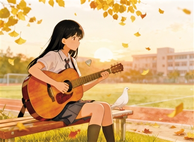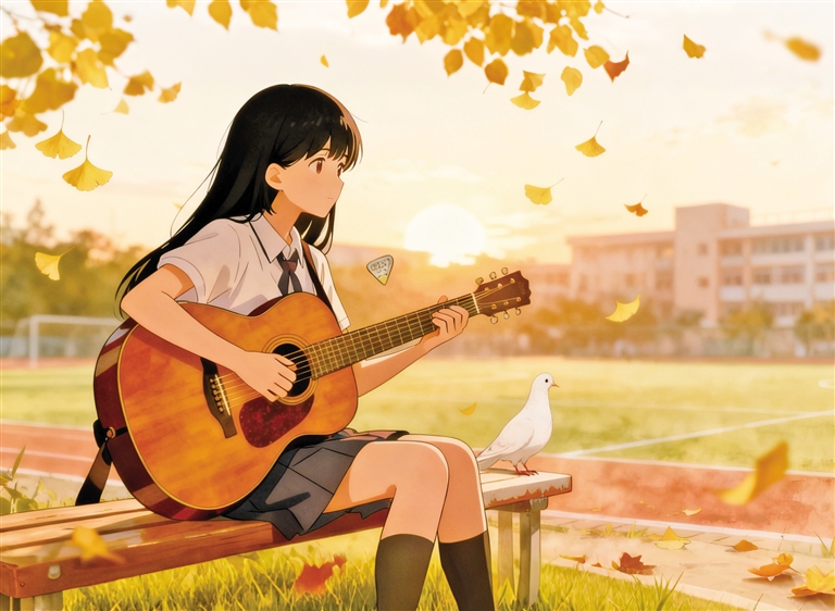 从那个周末起,去操场边听吉他成了我心照不宣的习惯。我总是选在离她不远不近的老地方——第三棵榕树下,刚好能看清她的侧影,又不会打扰那份专注。她常坐在看台最低的台阶上,微微低着头,长发偶尔滑落,便轻轻拢到耳后。我看不清她的面容,只能看见一双在琴弦上跳动的手,和一个专注的轮廓。