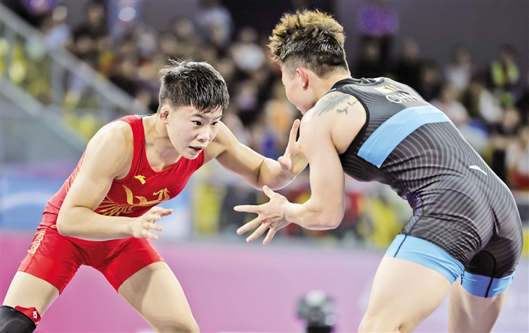 11月10日的十五运会摔跤赛场上,总有观众忍不住疑惑地揉揉眼睛——刚才那个姑娘不是才下场吗,怎么马上又上场了?其实,赛场上出现的,是一对来自江苏队的双胞胎姐妹张金和张玉。姐姐张金征战53公斤级,妹妹张玉主攻50公斤级。