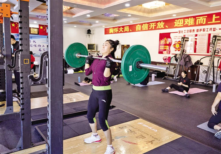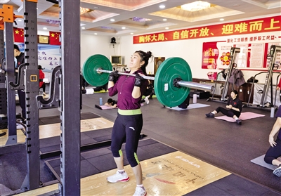 在食堂改造而成的临时体能训练馆里,队员徐梦桃在进行体能和力量训练。