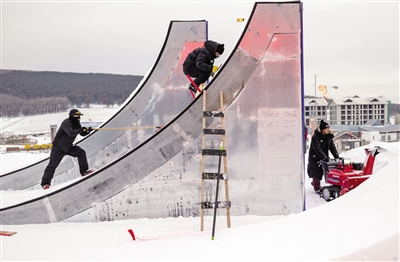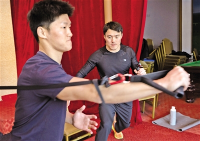 队员们的日常训练通常从清晨开始,天光初亮,他们已经在宾馆的走廊、会议室甚至电梯间门口开始拉伸和热身训练。简单的早饭后,他们会来到雪场顶着寒风反复起跳、旋转、落地,专注打磨每一个动作细节。3个小时的空中动作技术训练结束后,队员们在下午来到宾馆附近由食堂改造成的临时体能训练馆进行体能、力量训练。体能教练根据每个队员的身体状态科学安排训练强度和项目,确保他们在完成核心力量、爆发力及柔韧性等训练的同时保持良好状态。晚饭后,队员们相继走进由宾馆房间临时改造的恢复区,随队医生、康复师将为他们进行理疗、按摩,帮助恢复体能。