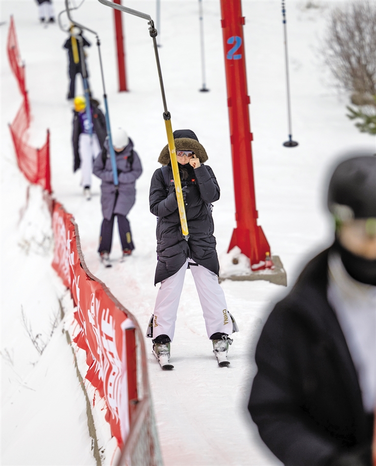 风雪中,队员们在牵引下爬上雪场,准备开始技术训练。